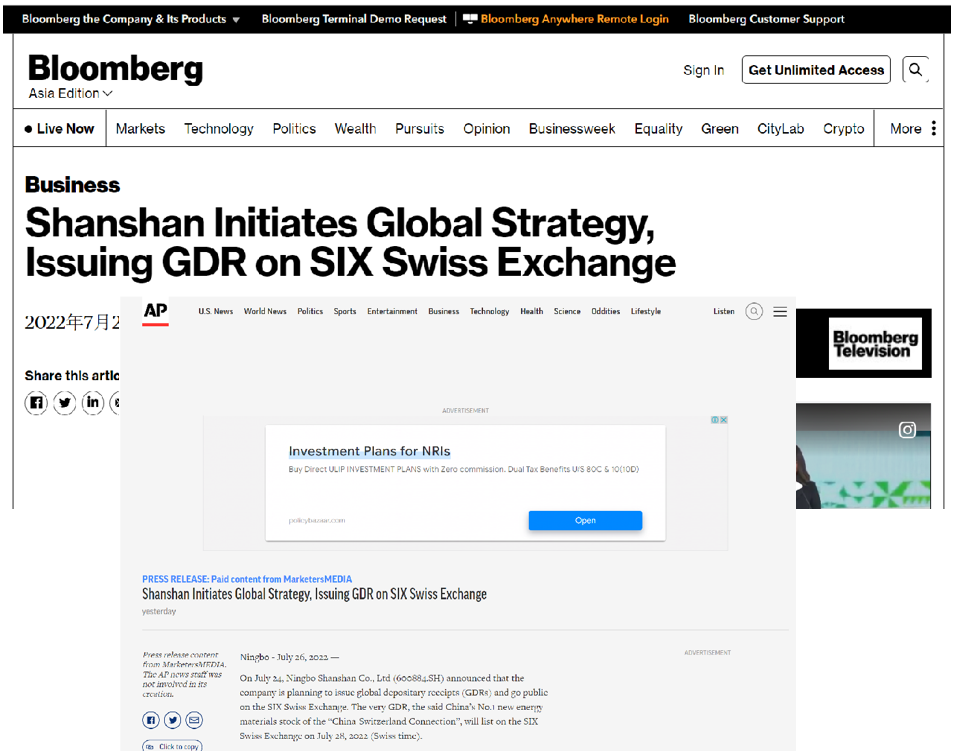 彭博社指出,杉杉股份成功申請發(fā)行GDR并在瑞士證券交易所上市,是中國新能源產(chǎn)業(yè)首批“中瑞通”,對于進(jìn)一步拓寬海外融資渠道,開拓海外市場,實(shí)現(xiàn)全球化戰(zhàn)略,極具創(chuàng)新意義。
