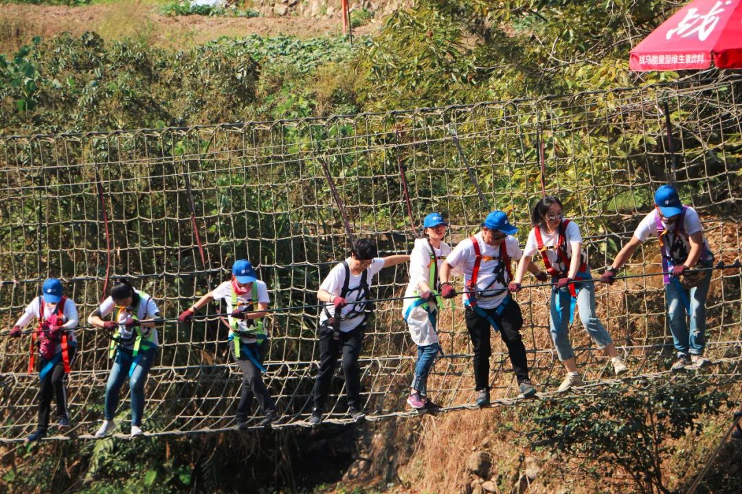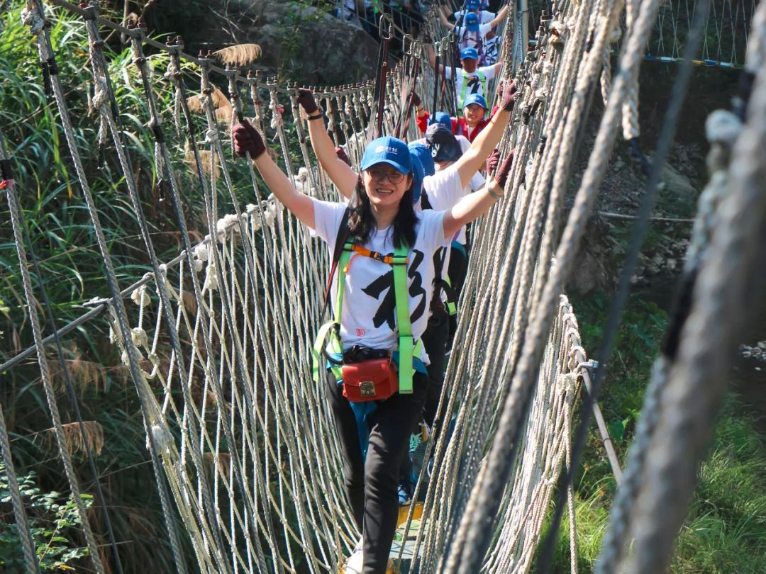 全部懸空的16道橋索僅靠一條安全繩和一雙手套,杉杉股份全員順利抵達(dá)終點(diǎn)。