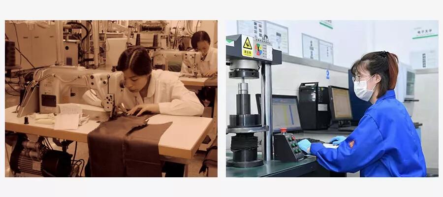 左圖:1998年女員工在傳統(tǒng)縫紉機(jī)前埋頭苦干 右圖:2019年技術(shù)人員在精密設(shè)備前從容操作